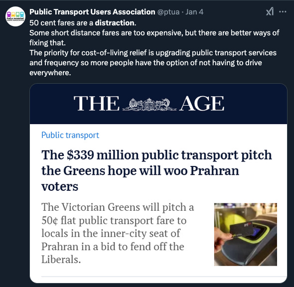 Although 50-cent fares are evidently beloved by most Queenslanders and look to be here to stay, the concept of ultra-low fares–or doing away with fares entirely–is fiercely opposed by some. Perhaps surprisingly, this includes some PT advocates who one might’ve thought unlikely figures to be opposing such a policy, let alone so vocally. Numerous prominent 'gunzel' (big-time train enthusiast) accounts on Twitter expressed extreme frustration with the Victorian Greens’ proposal, including outspokenly left-leaning ones. One went so far as to proclaim—earnestly, it would seem—that as a consequence they would no longer be voting for the Greens. Meanwhile, the apparently fare-hawk PTUA spat on the proposal, tweeting that it was a 'distraction' from improving services.